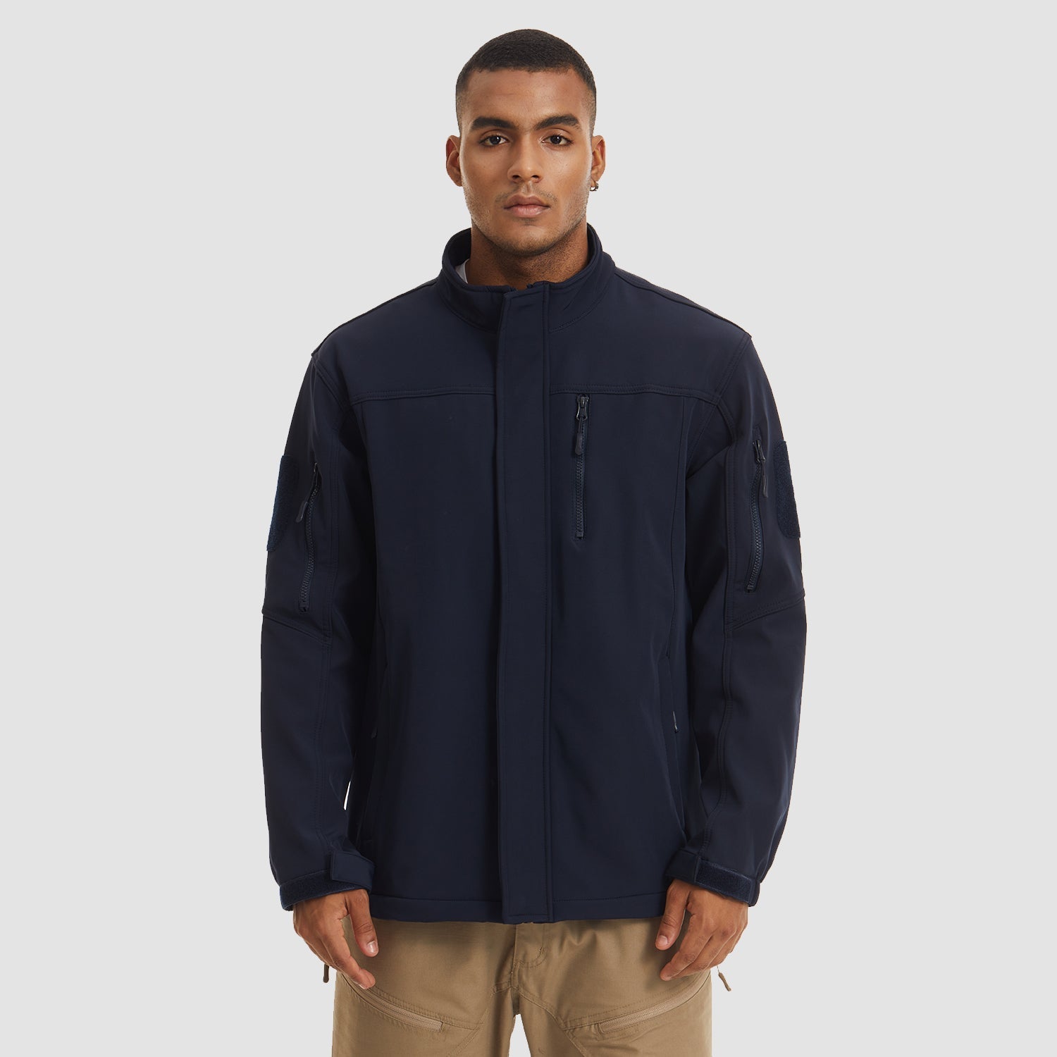 • Design: Military tactical style with stand-up collar, full zip closure, and arm patches.
